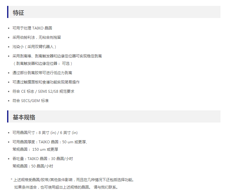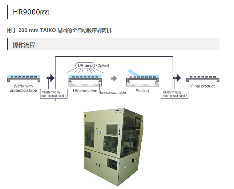 此款设备是一个全自动胶带剥离机,可将保护胶带(用于背面研磨处理)从带有图案的 TAIKO 晶圆表面剥离。