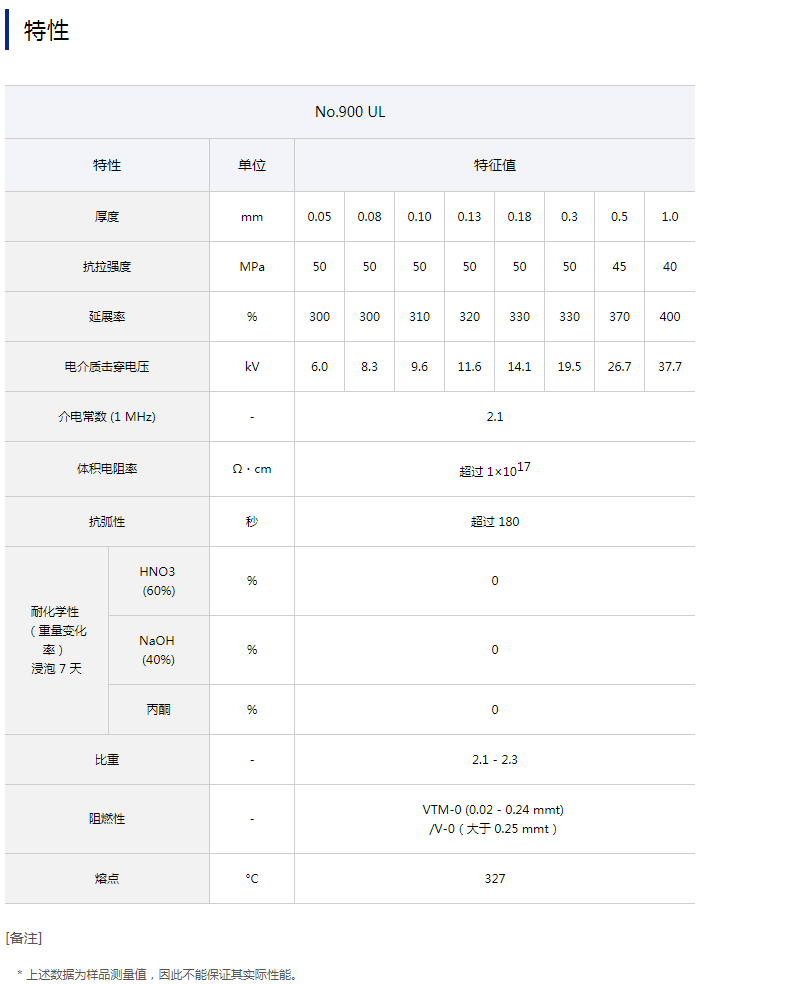 NITOFLON No.900UL 是一种聚四氟乙烯 (PTFE) 薄膜,具有多种优良的特征,如耐热性、耐化学性、良好的电气特性、摩擦系数低、无粘性等。