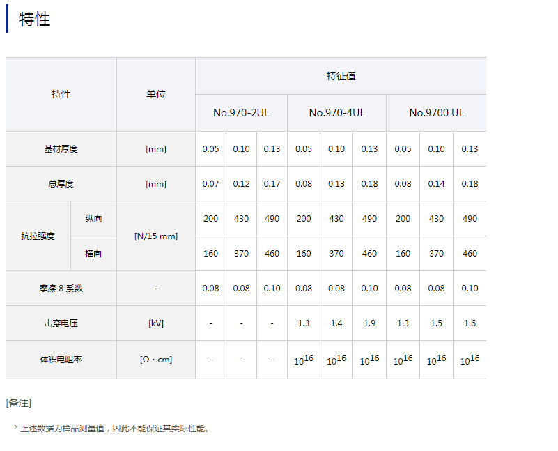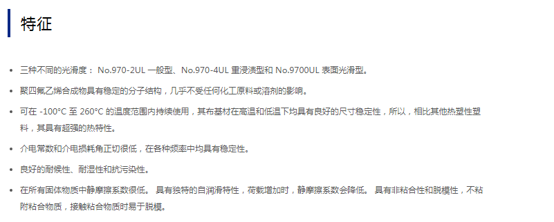 NITOFLON No.970-2UL/No.970-4UL/No.9700UL 由浸渍过聚四氟乙烯 (PTFE) 并经烧结的无碱玻璃布基材制成。 具有多种优良的特征,如耐化学性、电气特性、耐候性、无粘性等。