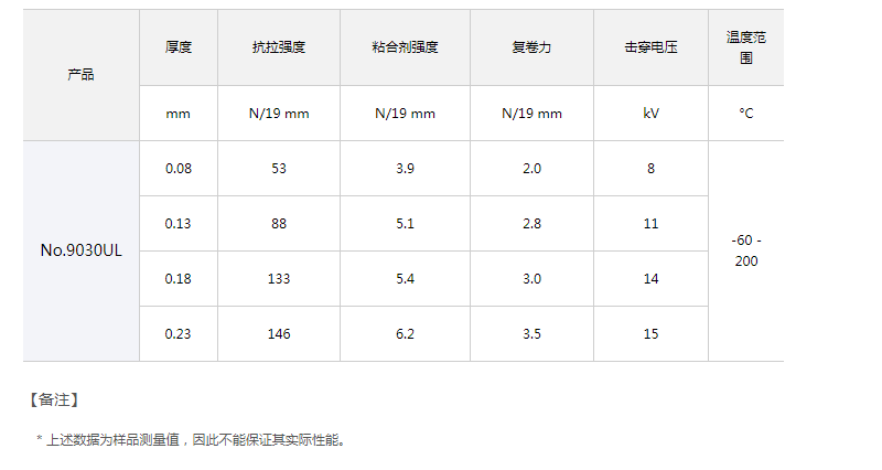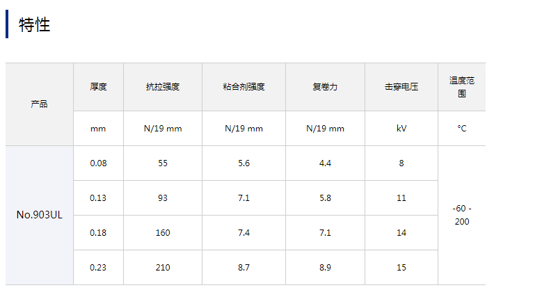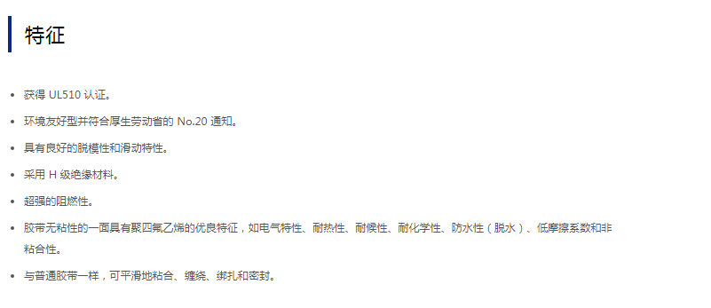 在聚四氟乙烯 (PTFE) 分散液中浸渍并经烧结的玻璃布基材。该胶带为单表面处理胶带,涂有耐热性和机械强度较强的硅树脂粘合剂。