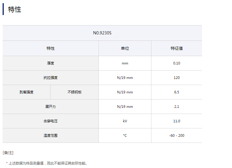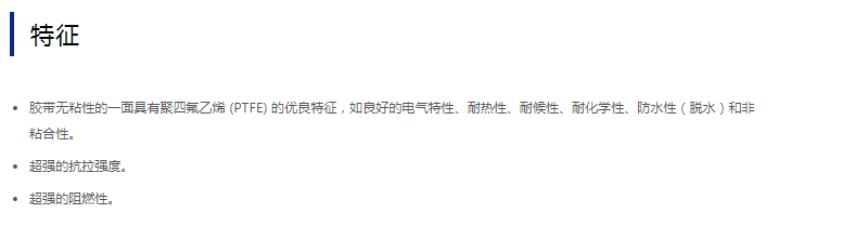 在聚四氟乙烯 (PTFE) 分散液中浸渍并经烧结的玻璃布基材。该胶带为单表面处理胶带,涂有耐热性和机械强度较强的硅树脂粘合剂。