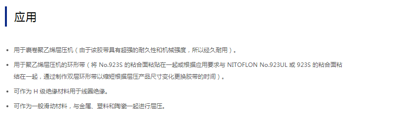 用于裹卷聚乙烯层压机等。 NITOFLON No.923UL 胶带的基材为 NITOFLON No.920UL(定向聚四氟乙烯薄膜)。 该胶带为单表面处理胶带,涂有耐热性较强的硅树脂粘合剂。 该胶带具有优良的特征,如电气特性、耐热性、耐化学性和非粘合性。