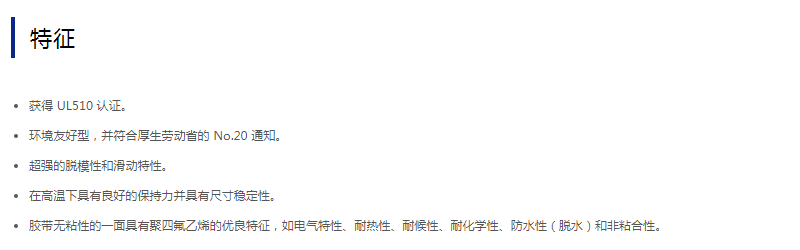 在聚四氟乙烯 (PTFE) 分散液中浸渍并经烧结的玻璃布基材。该胶带为单表面处理胶带,涂有耐热性和机械强度较强的硅树脂粘合剂。