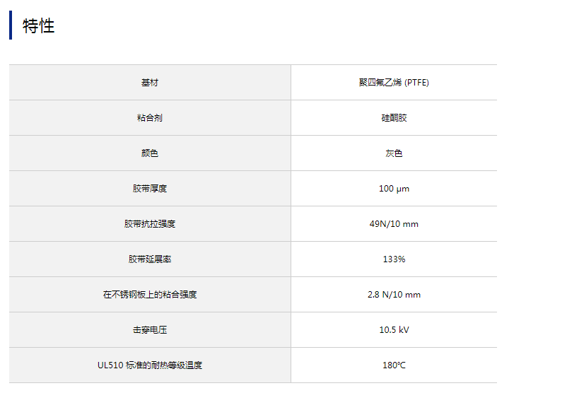 在聚四氟乙烯 (PTFE) 分散液中浸渍并经烧结的玻璃布基材。该胶带为单表面处理胶带,涂有耐热性和机械强度较强的硅树脂粘合剂。