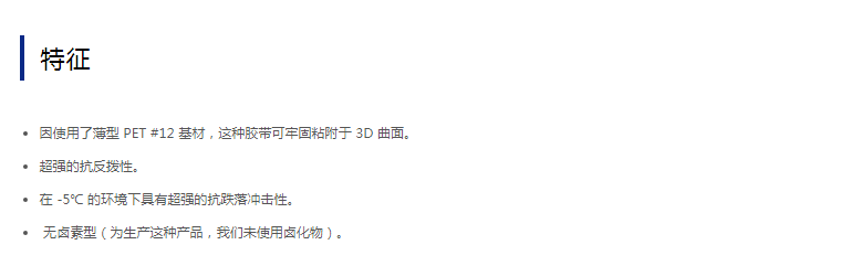 由改性压敏丙烯酸粘合剂制成的转移胶带,在表面能量低的被粘合体若需要特别高的粘合性时,该胶带可用作一般泡棉胶带进行粘贴。