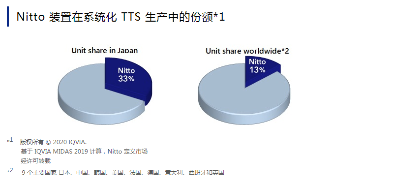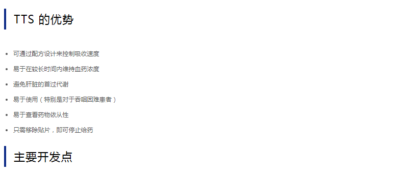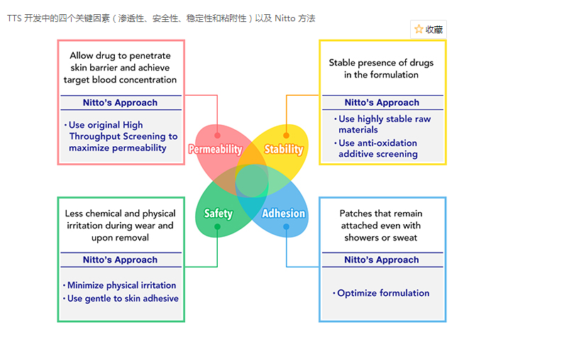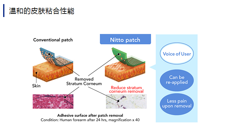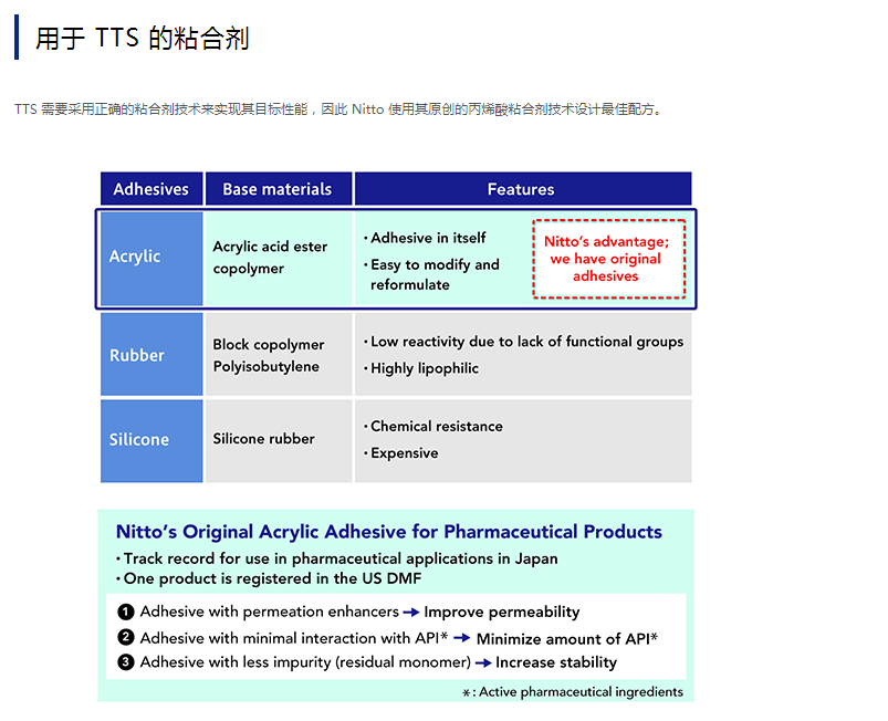 经皮给药系统(TTS)或称经皮贴片,是药物通过皮肤吸收进入人体的一种方法。TTS 是一种非常有用的给药形式,有很多优势。其一是当贴片贴至皮肤时,目视即可确认给药。此外,这些配方旨在控制药物吸收速率,有助于在较长时间内维持血药浓度。