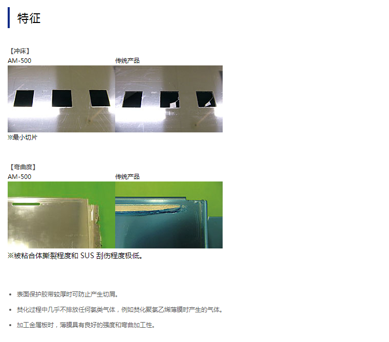 SPV-AM-500 是一种以特殊薄膜为基材的表面保护材料,可用于金属板加工。 SPV-AM-500 可用于冲床加工 (NCT) 和激光加工。