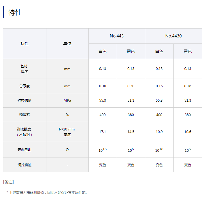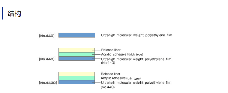No. 443 和 No. 4430 为压敏胶带,其离型纸以超高分子量聚乙烯薄膜为基底 (No. 440)。 相对于采用其他塑料薄膜的胶带来说,此款胶带具有极强的耐冲击性、耐候性和自润滑性。