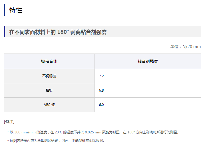 由改性压敏丙烯酸粘合剂制成的转移胶带,在表面能量低的被粘合体若需要特别高的粘合性时,该胶带可用作一般泡棉胶带进行粘贴。